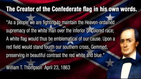 Yet I do want to highlight one additional source with direct relevance to this debate- William T. Thompson, the designer of the “Stainless Banner,”which became the second national Confederate flag (pictured above). He noted that the design of the flag, in keeping with the ideals of the Confederacy, was meant to convey the south’s belief in white racial superiority. It was the reason, he claimed, that he imposed the battle flag of the Army of Northern Virginia over a white background when he created the “Stainless Banner” for the Confederacy in 1863.