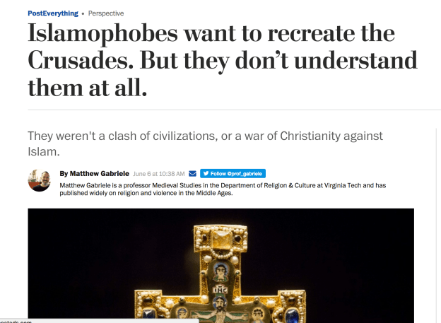 Today, I read a curious essay in the Washington Post by Professor Matthew Gabriele, a fellow historian of the crusades, titled Islamophobes want to recreate the Crusades. But they don’t understand them at all. I’ve never met Professor Gabriele, but I am familiar with his scholarship. In his essay, he made some strong claims about what crusade historians believe, as well as the nature of the Islamic threat facing eastern Christians in the era of the First Crusade and how that threat was understood by western Christians at the time. I want to consider some points related to his comments on those issues here.
